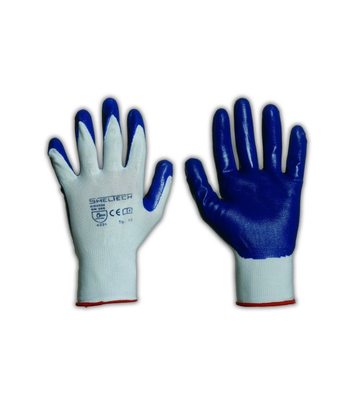 Guanto in nylon bianco senza cuciture, copertura leggera in nitrile royal che offre doti di presa senza confronti in differenti condizioni di utilizzo, leggero ed ergonomico, tessuto molto flessibile che aiuta la maneggevolezza, dorso areato per ventilare meglio la mano