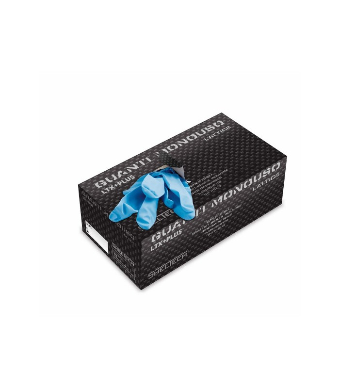 Confezione da 50 paia di guanti monouso in lattice di gomma naturale spessorato di colore blu ad alta resistenza, non sterile e senza polvere lubrificante. ambidestro con bordino, a finitura interna opaca ed esterna microruvida, di spessore e lunghezza maggiorata