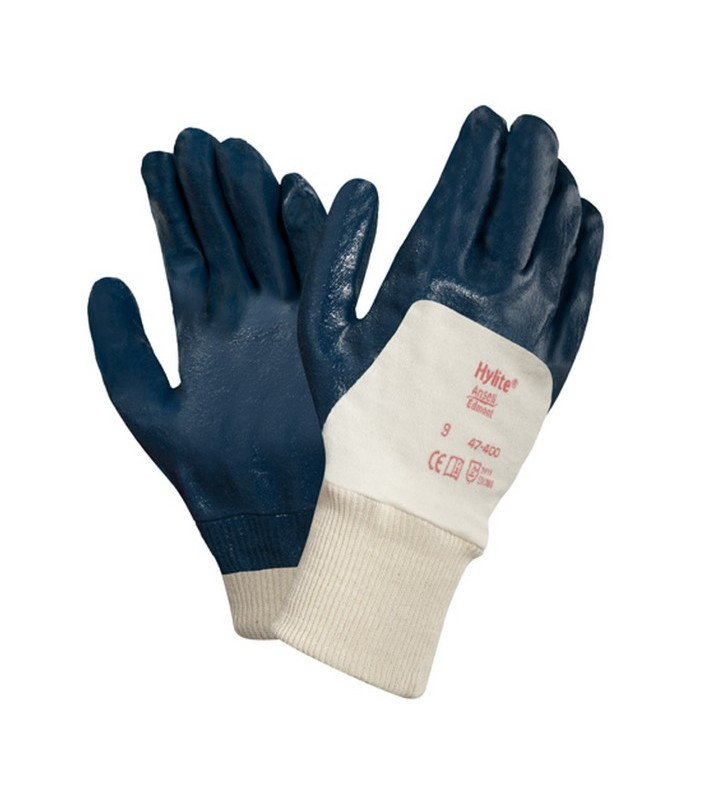 Guanto tagliato e cucito, fodera in cotone interlock, rivestimento in nitrile, polso lavorato a maglia, lunghezza mm 270