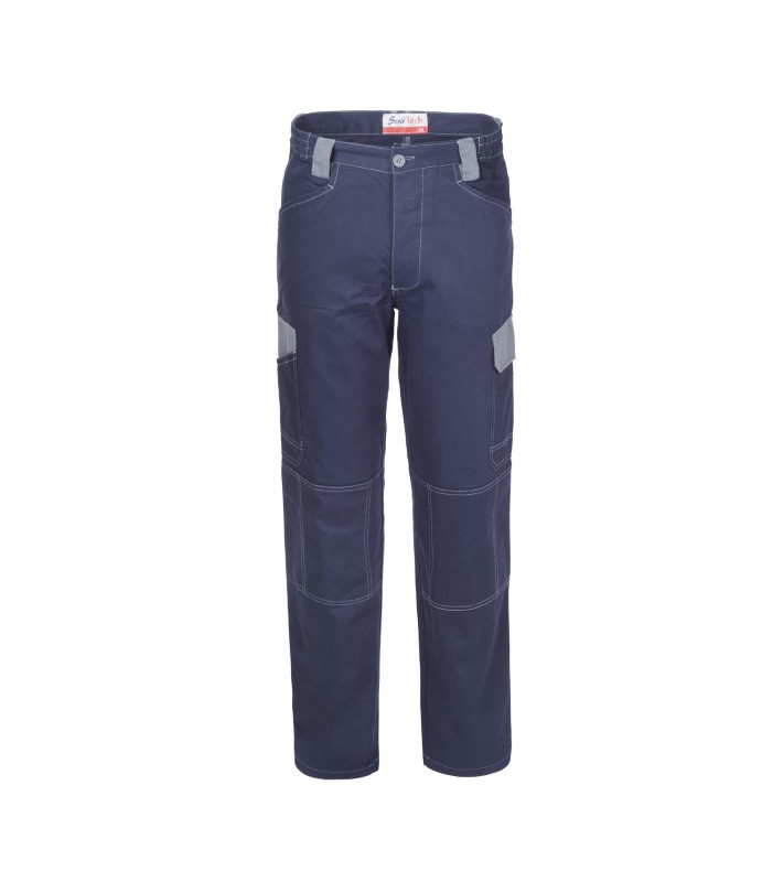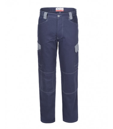 Chiusura alla patta con bottoni coperti, 2 tasche anteriori alla caretera, cintura con elastico ai fianchi e passanti larghi 3 cm di colore in contrasto, 2 tasche posteriori applicate chiuse con aletta e velcro, 1 tasca e 1 taschino metro applicati su gamba destra, 1 tascone applicato su gamba sinistra chiuso con aletta e velcro, imbottitura alle ginocchia, rinforzo con doppio tessuto a tutte le tasche e relative alette di colore a contrasto, cuciture con filo di colore a contrasto canvas, 100% cotone irrestringibile, peso 270 g/m2 con varianti in tessuto 65% poliestere e 35% cotone