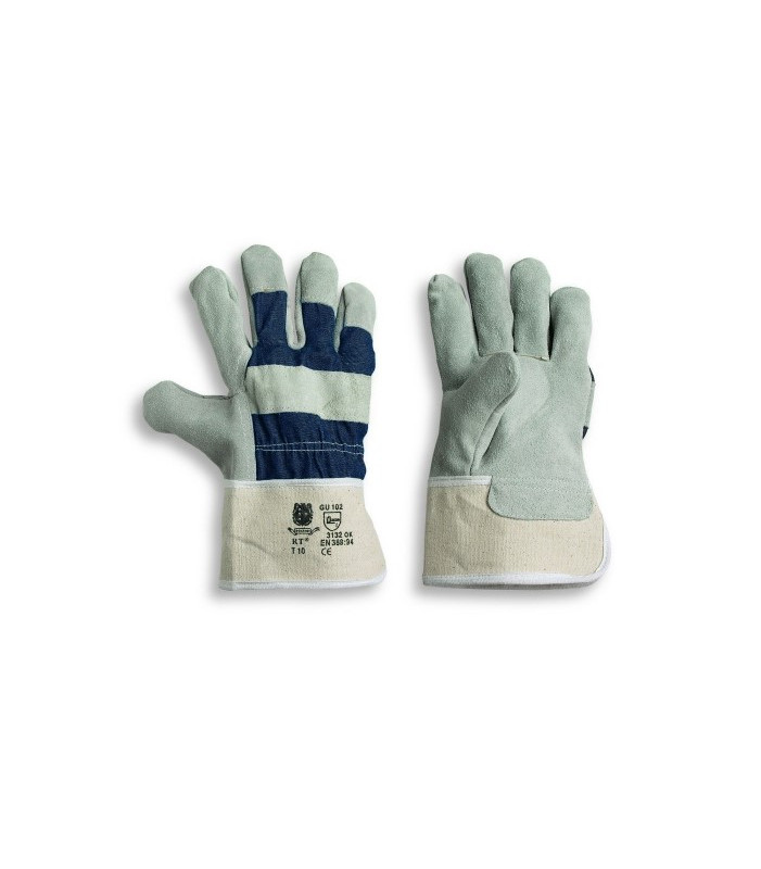 Guanto con palmo in crosta, felpato internamente, dorso jeans con elastico interno, manichetta di sicurezza tela rigida da cm 7, resistente al taglio, all'abrasione e allo strappo