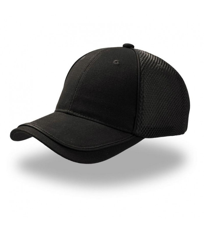 6 pannelli, piping, occhielli ricamati, mesh posteriore, mesh laterale, pannello frontale rinforzato, visiera pre-curvata, chiusura in velcro, parasudore: 35% cotone