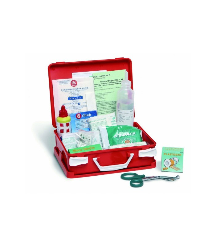 Adatto fino a due dipendenti. valigetta realizzata in plastica, supporto per attacco a parete, maniglia per trasporto, chiusura con 2 clip rotanti. contenuto: 1 copia decreto min 388 del 15.07.03 2 paia guanti sterili 1 flacone disinfettante 125 ml iodopovidone al 10% iodio pmc 1 soluzione fisiologica sterile 250 ml ce 1 busta compressa garza sterile cm 18x40 3 buste compressa garza sterile cm 10x10 1 pinza sterile 1 confezione di cotone idrofilo 1 plastosan 10 cerotti assortiti 1 rocchetto cerotto adesivo m 5x2,5 cm 1 benda di garza da m 3,5x10 cm 1 paio di forbici tagliabendaggi 1 laccio emostatico 1 ice pack ghiaccio istantaneo monouso 1 sacchetto per rifiuti sanitari mm 250x350 1 istruzioni multilingua pronto soccorso
