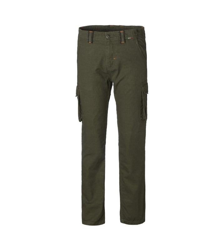 Chiusura alla patta con cerniera e bottone in cintura, 2 tasche anteriori interne, 2 tasconi con soffietti laterali su gambe chiusi con aletta e velcro, 1 tasca posteriore interna chiusa con aletta e velcro, elastico ai fianchi interno regolabile, passanti in cintura rinforzati 35% cotone, 65% poliestere peso 210 g/m2