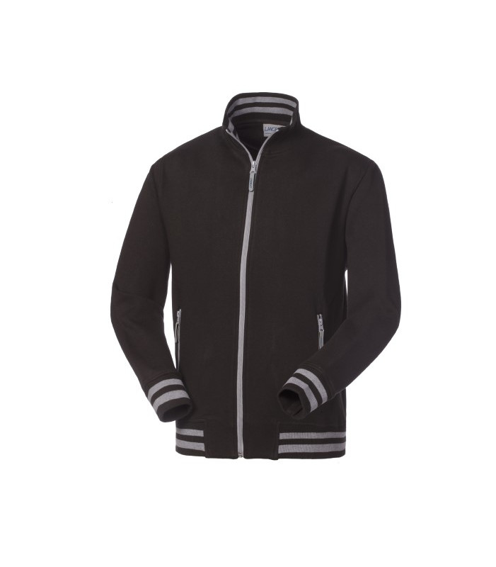 Chiusura con cerniera centrale in plastica, 2 tasche inferiori a filetto chiuse con cerniera in plastica, polsi e fascia girovita in maglia elastica con inserti di colore a contrasto, collo in maglia elastica di colore in tinta con inserti di colore a contrasto all’interno, parasudore interno al collo 70% cotone 30% poliestere, peso 310 g/m2