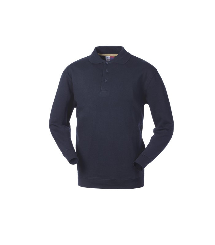Collo a polo chiuso con tre bottoni, giromaniche diritto, polsi e fascia girovita in maglia elastica a costine 2/1 con doppie cuciture, parasudore interno al collo 100% cotone peso 270 g/m2