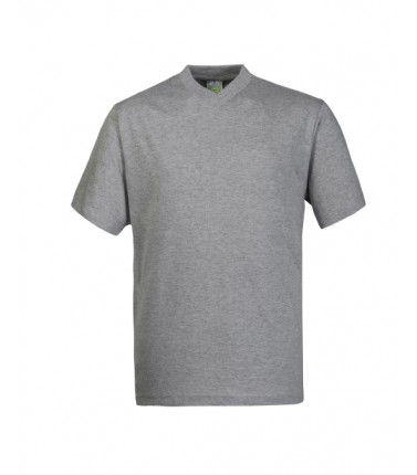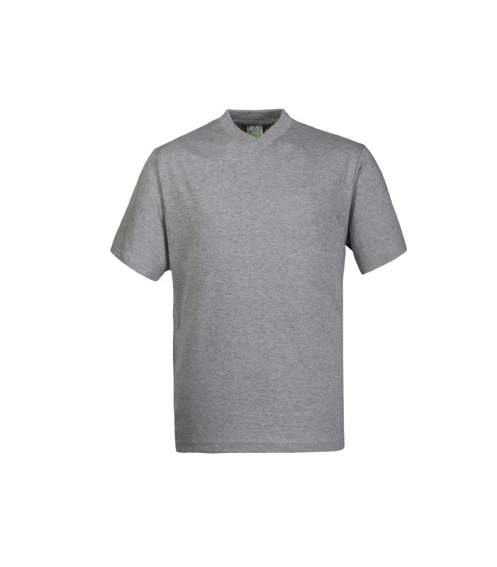 Collo a v, fascia parasudore nella parte posteriore del collo, doppia ribattitura al collo e alle spalle 100% cotone, peso 150 g/m2 per i colorati, peso 145 g/m2 per il bianco 85% cotone piquè, 15% viscosa solo per il colore grigio melange