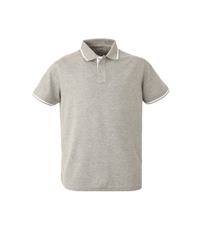 Collo chiuso con 3 bottoni, sottocollo, fascia parasudore e bottoniera di colore a contrasto, giromanica a costina, spacchetti laterali al fondo di colore a contrasto, inserti di colore a contrasto al giromanica e al collo. 100% cotone piqué 85% cotone piqué, 15% viscosa solo per il colore grigio melange peso 200 g/m2