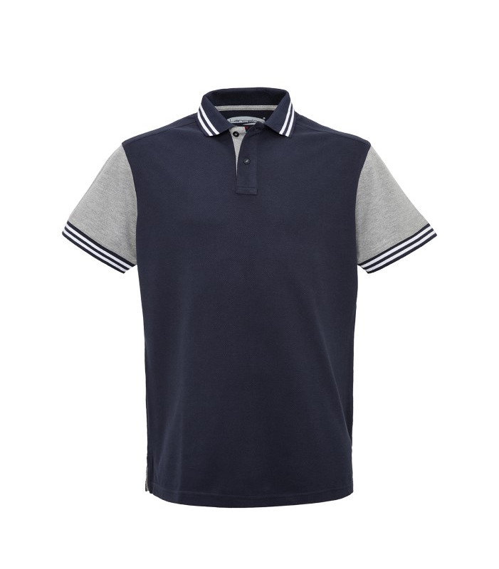 Collo chiuso con 2 bottoni, sottocollo, fascia parasudore e bottoniera di colore a contrasto, giromanica a costina, spacchetti laterali al fondo di colore a contrasto, inserti di colore a contrasto al giromanica e al collo, inserto nel sottocollo per eventuale personalizzazione 100% cotone piqué 85% cotone piqué, 15% viscosa solo per il colore grigio melange peso 225 g/m2