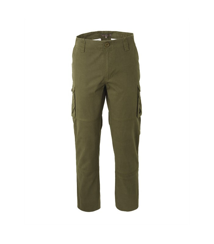 Chiusura alla patta con cerniera e bottone in cintura, 2 tasche anteriori interne, 2 tasche posteriori a filetto chiuse con aletta e bottone, 2 tasconi con soffietti laterali chiusi con aletta e bottone, elastico ai fianchi interno regolabile. 100% cotone peso 240 g/m2