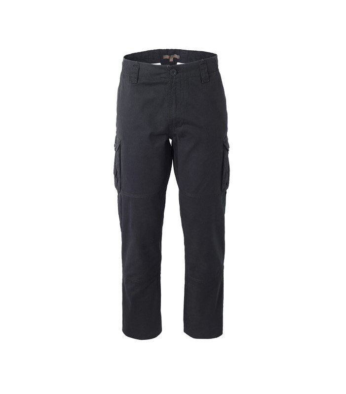 Chiusura alla patta con cerniera e bottone in cintura, 2 tasche anteriori interne, 2 tasche posteriori a filetto chiuse con aletta e bottone, 2 tasconi con soffietti laterali chiusi con aletta e bottone, elastico ai fianchi interno regolabile. 100% cotone peso 240 g/m2