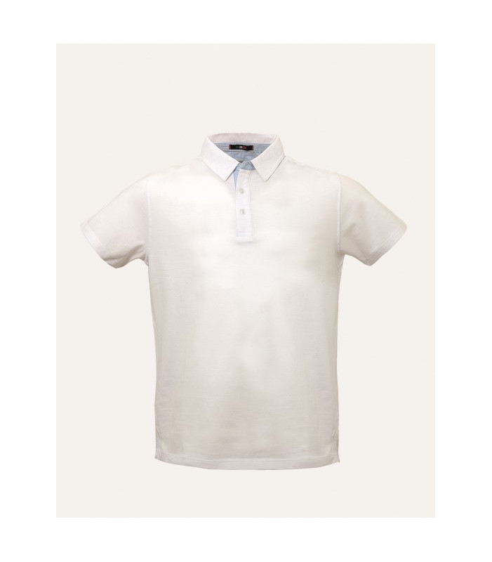Collo chiuso con 3 bottoni, fascia parasudore in tessuto oxford di colore a contrasto nel collo e sottocollo, spacchetti laterali al fondo con inserto di colore a contrasto 100% cotone jersey, peso 160 g/m2