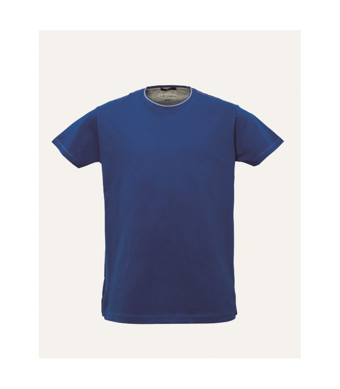 Girocollo a costine con profilo di colore a contrasto, fascia parasudore e lunetta di colore a contrasto nella parte posteriore del collo, doppia cucitura di colore a contrasto al giromanica, sulle spalle e posteriore al collo. 100% cotone 98% cotone 2% viscosa solo per il colore grigio melange peso 160 g/m2