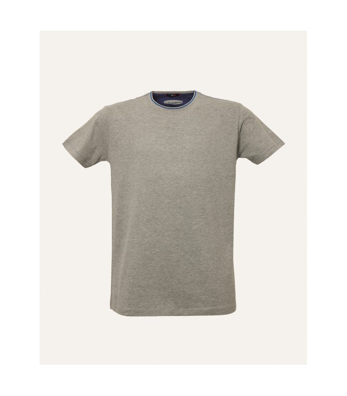 Girocollo a costine con profilo di colore a contrasto, fascia parasudore e lunetta di colore a contrasto nella parte posteriore del collo, doppia cucitura di colore a contrasto al giromanica, sulle spalle e posteriore al collo. 100% cotone 98% cotone 2% viscosa solo per il colore grigio melange peso 160 g/m2