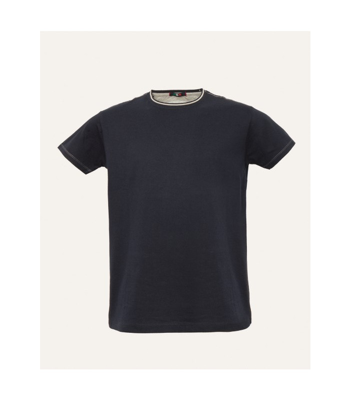 Girocollo a costine con profilo di colore a contrasto, fascia parasudore e lunetta di colore a contrasto nella parte posteriore del collo, doppia cucitura di colore a contrasto al giromanica, sulle spalle e posteriore al collo. 100% cotone 98% cotone 2% viscosa solo per il colore grigio melange peso 160 g/m2