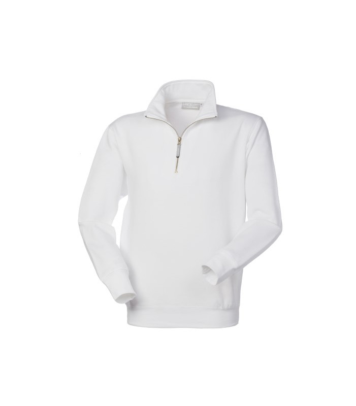 Collo alto chiuso con cerniera corta in plastica, polsi e fascia girovita in maglia elastica, parasudore interno al collo. (anche la felpa bianca ha la cerniera in plastica) 80% cotone 20% poliestere, peso 290 g/m2