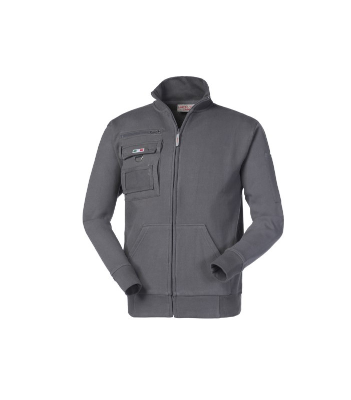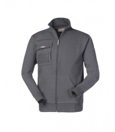 Chiusura centrale con cerniera in plastica, 2 tasconi anteriori, polsi, collo e parte della fascia girovita in maglia elastica, portapenne a doppio scomparto applicato sulla manica sinistra, 1 taschino chiuso con aletta e punti velcro applicato al petto destro, porta badge in pvc removibile applicato con velcro, 1 taschino a filetto chiuso con cerniera a petto destro. 70% cotone 30% poliestere, peso 310 g/m2
