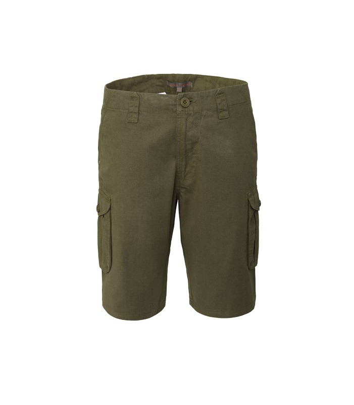 Chiusura alla patta con cerniera e bottone in cintura, 2 tasche anteriori interne, 2 tasche posteriori a filetto chiuse con aletta e bottone, 2 tasconi con soffietti laterali chiusi con aletta e bottone, elastico ai fianchi interno regolabile. 100% cotone, peso 240 g/m2