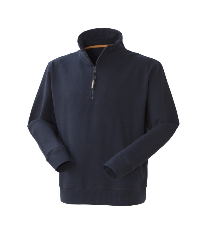 Collo alto chiuso con cerniera corta in plastica, polsi e fascia girovita in maglia elastica, parasudore interno al collo di colore a contrasto. la felpa di colore bianco ha la zip in metallo e il parasudore in tinta. 100% cotone peso 280 g/m2 con felpatura interna