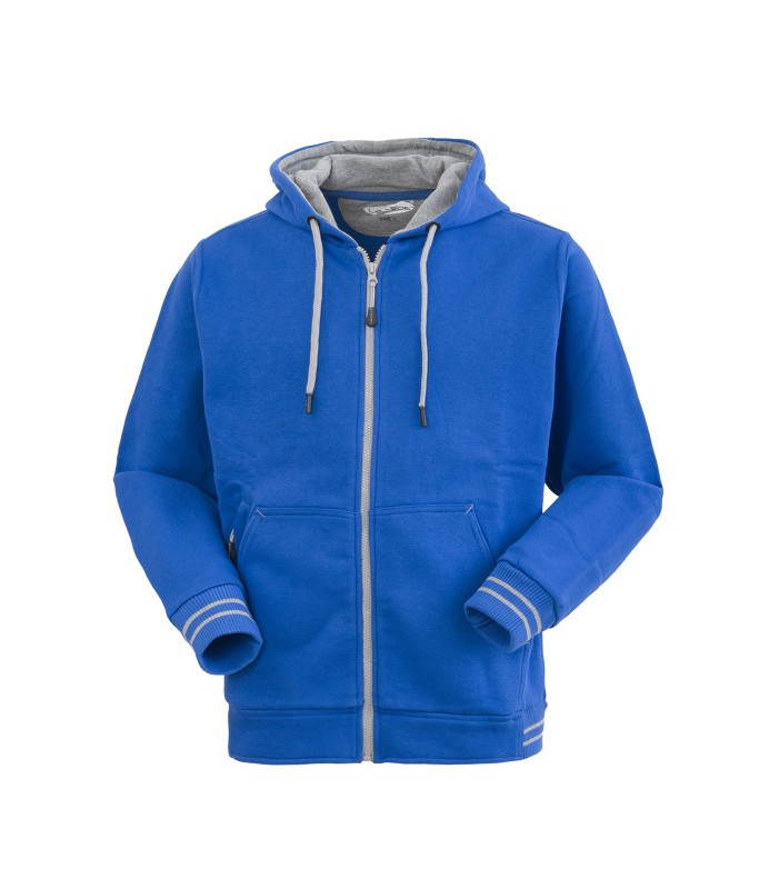 Chiusura centrale con cerniera in plastica, 2 tasconi anteriori, 1 taschino a filetto inferiore a destra chiuso con cerniera, giro maniche dritto, cappuccio chiuso con cordino, interno del cappuccio di colore a contrasto, parasudore interno al collo, polsi e fascia girovita in maglia elastica con inserti di colore a contrasto. 80% cotone 20% poliestere, peso 310 g/m2