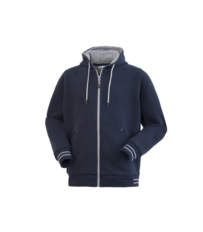 Chiusura centrale con cerniera in plastica, 2 tasconi anteriori, 1 taschino a filetto inferiore a destra chiuso con cerniera, giro maniche dritto, cappuccio chiuso con cordino, interno del cappuccio di colore a contrasto, parasudore interno al collo, polsi e fascia girovita in maglia elastica con inserti di colore a contrasto. 80% cotone 20% poliestere, peso 310 g/m2