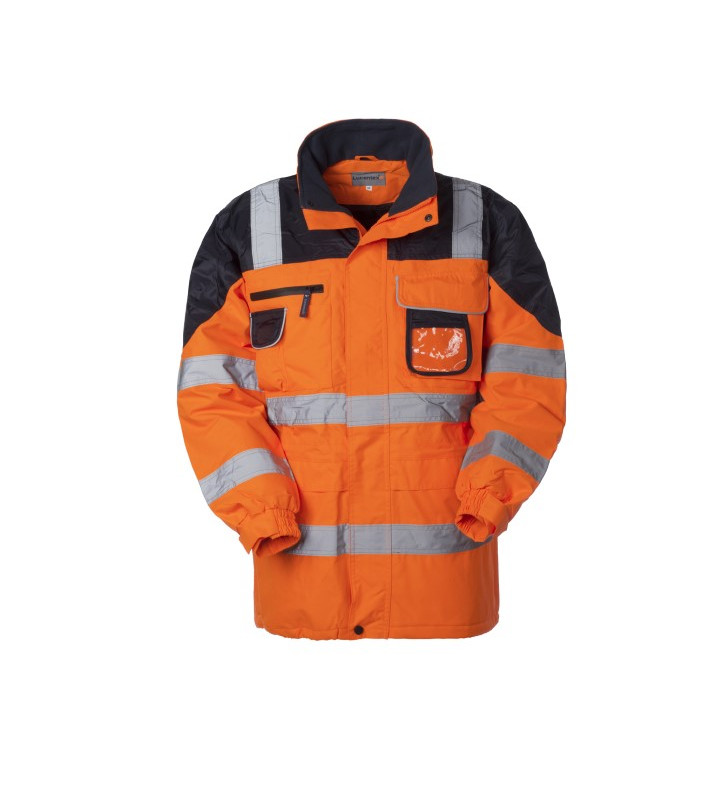Chiusura anteriore con cerniera centrale coperta da patella chiusa con punti velcro, 2 tasche inferiori coperte da aletta, 1taschino applicato al petto destro chiuso con cerniera, portacellulare applicato su taschino destro chiuso con aletta con profilo rifrangente e velcro, 1 taschino applicato al petto sinistro chiuso con aletta con profilo rifrangente e punto velcro, ulteriore taschino removibile per possibilità di ricamo, porta badge in pvc removibile, 1 taschino interno a filetto chiuso con punto velcro al petto sinistro, polsi con elastico e alamaro regolabile con velcro, coulisse in vita e al fondo, cappuccio con coulisse di chiusura inserito nel collo chiuso con velcro, doppie bande rifrangenti applicate alle maniche, al girovita, verticale anteriore e posteriore alta visibilità 100% poliestere traspirante con cuciture termonastrate invernale con ovatta e fodera in nylon