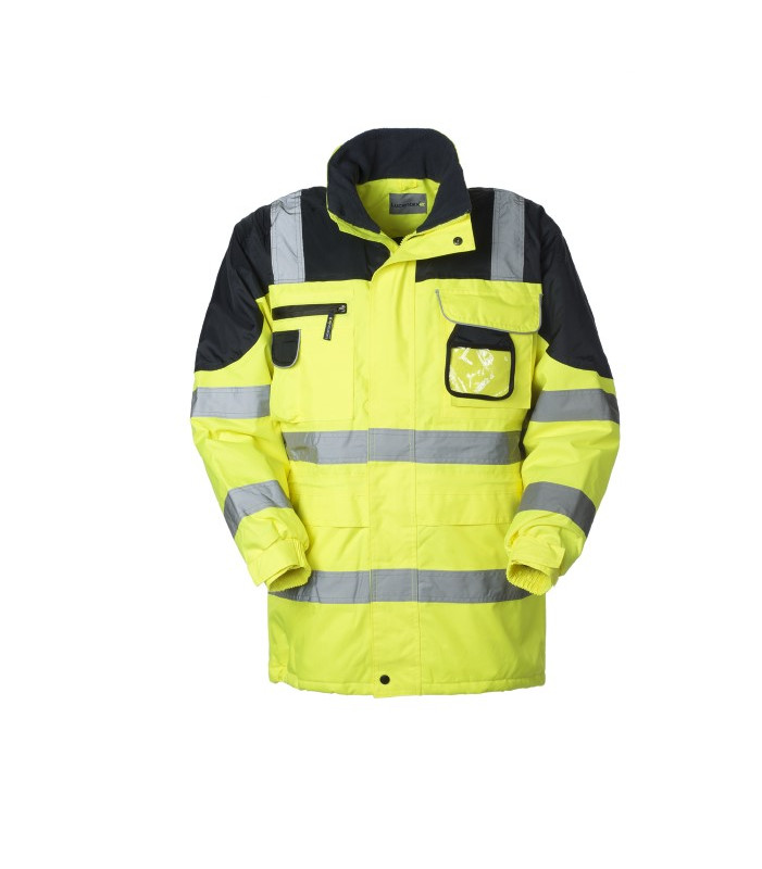 Chiusura anteriore con cerniera centrale coperta da patella chiusa con punti velcro, 2 tasche inferiori coperte da aletta, 1taschino applicato al petto destro chiuso con cerniera, portacellulare applicato su taschino destro chiuso con aletta con profilo rifrangente e velcro, 1 taschino applicato al petto sinistro chiuso con aletta con profilo rifrangente e punto velcro, ulteriore taschino removibile per possibilità di ricamo, porta badge in pvc removibile, 1 taschino interno a filetto chiuso con punto velcro al petto sinistro, polsi con elastico e alamaro regolabile con velcro, coulisse in vita e al fondo, cappuccio con coulisse di chiusura inserito nel collo chiuso con velcro, doppie bande rifrangenti applicate alle maniche, al girovita, verticale anteriore e posteriore alta visibilità 100% poliestere traspirante con cuciture termonastrate invernale con ovatta e fodera in nylon