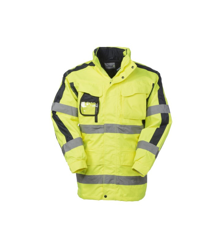 Giaccone multiuso composto da un impermeabile esterno e da un giubbotto interno invernale con maniche staccabili di colore blu e con possibilità di utilizzo anche separato. impermeabile esterno chiusura anteriore con cerniera centrale coperta da patella chiusa con punti velcro, 2 tasche inferiori coperte da aletta, 1 taschino applicato al petto destro chiuso con aletta e velcro e ulteriore taschino chiuso con cerniera verticale, porta badge in pvc removibile, 1 taschino applicato al petto sinistro chiuso con aletta e velcro e ulteriore taschino removibile per possibilità di ricamo, cappuccio con coulisse di chiusura inserito nel collo chiuso con velcro, 1 taschino interno sotto il copri cerniera, 1 taschino interno applicato al petto sinistro chiuso con punto velcro, polsi con elastico e alamaro regolabile con velcro, coulisse in vita, doppie bande rifrangenti applicate alle maniche e al girovita giubbotto interno chiusura anteriore con cerniera centrale, 2 tasche inferiori applicate chiuse con aletta e punto velcro, 1 taschino interno applicato al petto, maniche staccabili, polsi in maglia, una banda rifrangente al girovita e doppia banda rifrangente verticale anteriore e posteriore