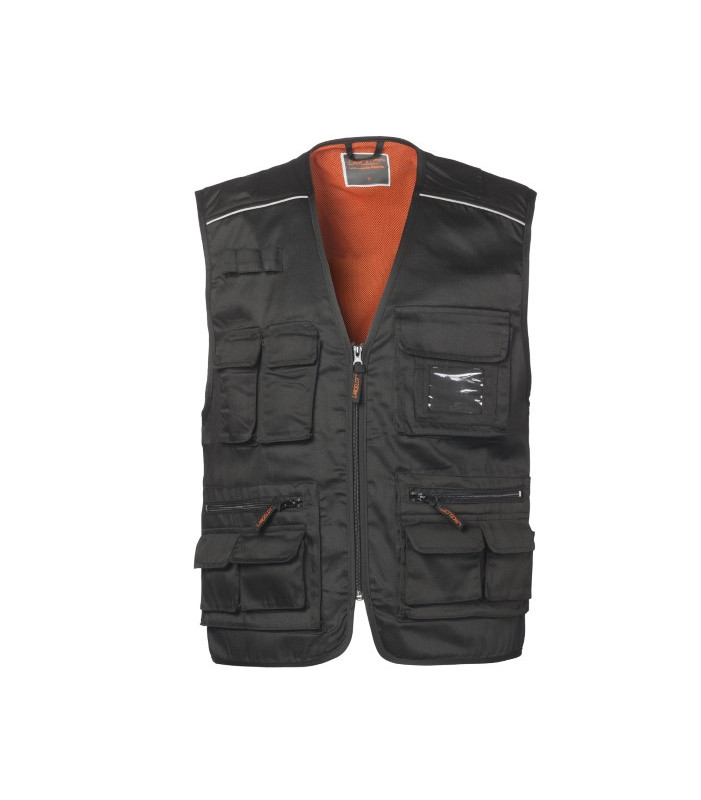 Scollo a v, chiusura anteriore con cerniera, carrè anteriore con profilo rifrangente a contrasto, un taschino applicato al petto sinistro con soffietto chiuso con aletta e velcro, portabadge in pvc chiuso con velcro applicato sul taschino sinistro, due taschini portacellulare con soffietto chiusi con aletta e velcro applicati al petto destro, portapenne a 3 scomparti su petto destro al di sopra dei taschini portacellulare, due tasconi con soffietto chiusi con cerniera applicati inferiormente, due piccoli taschini con soffietto chiusi con aletta e velcro applicati sui tasconi inferiori. 65% poliestere 35% cotone, peso 210 g/m2 foderato internamente fino a metà schiena con rete 100% poliestere