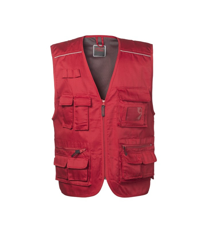 Scollo a v, chiusura anteriore con cerniera, carrè anteriore con profilo rifrangente a contrasto, un taschino applicato al petto sinistro con soffietto chiuso con aletta e velcro, portabadge in pvc chiuso con velcro applicato sul taschino sinistro, due taschini portacellulare con soffietto chiusi con aletta e velcro applicati al petto destro, portapenne a 3 scomparti su petto destro al di sopra dei taschini portacellulare, due tasconi con soffietto chiusi con cerniera applicati inferiormente, due piccoli taschini con soffietto chiusi con aletta e velcro applicati sui tasconi inferiori. 65% poliestere 35% cotone, peso 210 g/m2 foderato internamente fino a metà schiena con rete 100% poliestere