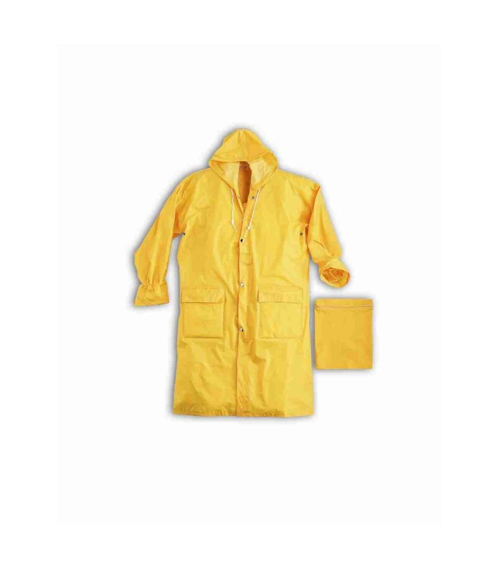 Chiusura con bottoni automatici, elastico interno ai polsi, maniche raglan, cappuccio fisso con cordino, carrè posteriore aerato, fori di aerazione sotto le ascelle, inserita in busta di poliestere con cerniera, 2 tasche applicate chiuse con aletta 100% poliestere spalmato interno in pvc