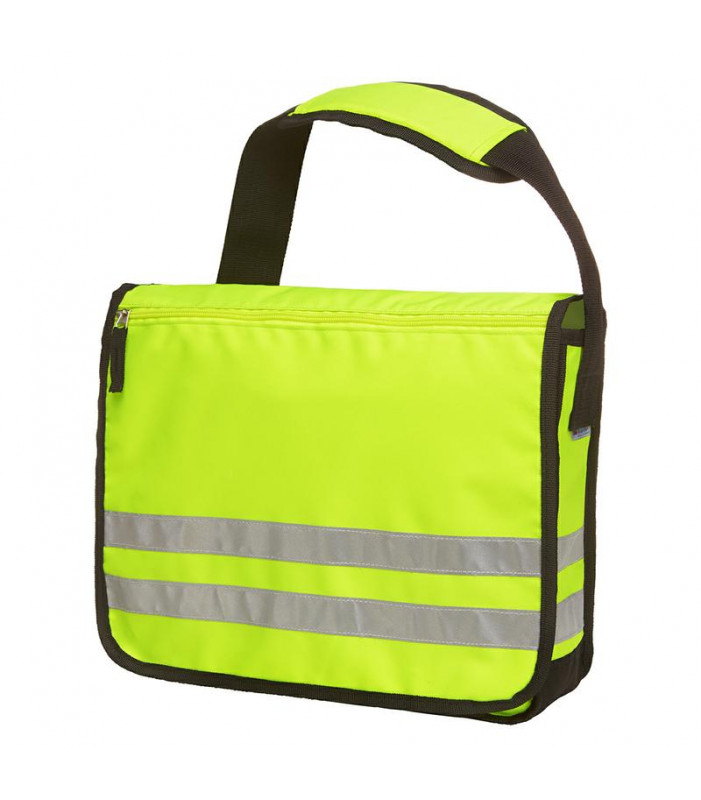 borsa a tracolla, ampio scomparto principale, scomparto piatto con elementi organizer, tasca con chiusura lampo sulla patta, tracolla di lunghezza regolabile con spallina imbottita cucita, tessuto principale giallo neon luminoso con