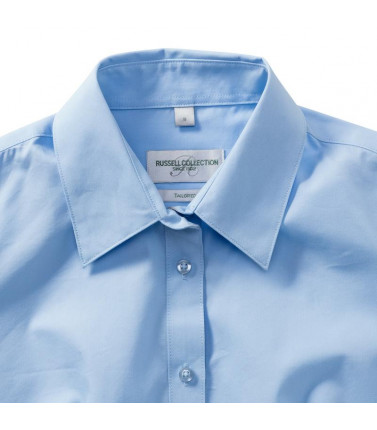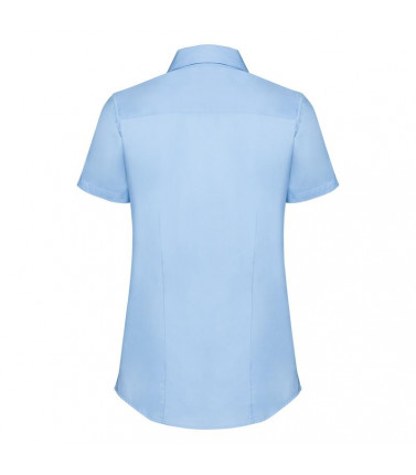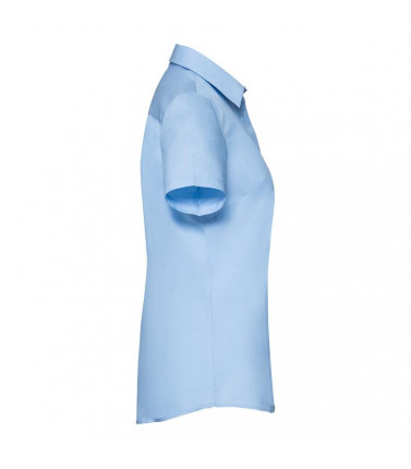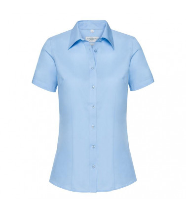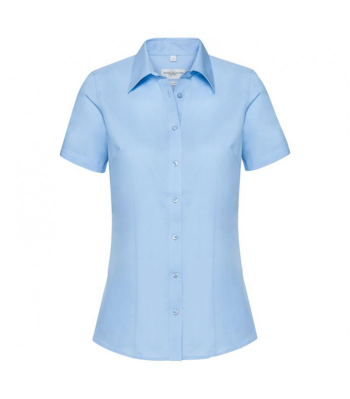 70% cotone, 30% coolmax poliestere. camicia da donna a maniche corte con colletto dal taglio moderno e pulito,