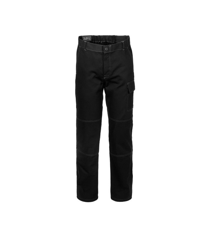 Chiusura alla patta con cerniera e bottone scoperto, 2 tasche anteriori interne, 1 tasca posteriore applicata a destra chiusa con bottone, 1 porta metro, 1 portapenne e 1 tascone laterale applicati a sinistra chiuso con aletta e velcro, elastico in vita posteriore, cuciture di colore a contrasto. drill 3/1, 100% cotone irrestringibile, peso 280 g/m2
