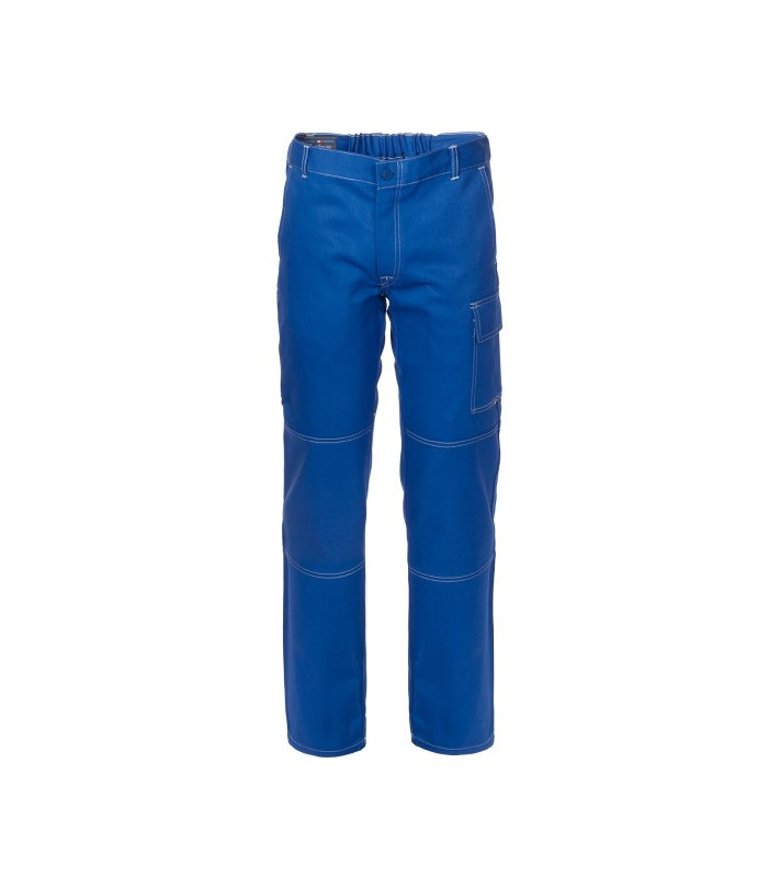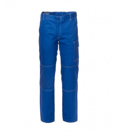Chiusura alla patta con cerniera e bottone scoperto, 2 tasche anteriori interne, 1 tasca posteriore applicata a destra chiusa con bottone, 1 porta metro, 1 portapenne e 1 tascone laterale applicati a sinistra chiuso con aletta e velcro, elastico in vita posteriore, cuciture di colore a contrasto. drill 3/1, 100% cotone irrestringibile, peso 280 g/m2
