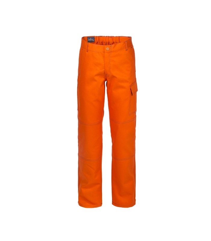 Chiusura alla patta con cerniera e bottone scoperto, 2 tasche anteriori interne, 1 tasca posteriore applicata a destra chiusa con bottone, 1 porta metro, 1 portapenne e 1 tascone laterale applicati a sinistra chiuso con aletta e velcro, elastico in vita posteriore, cuciture di colore a contrasto. drill 3/1, 100% cotone irrestringibile, peso 280 g/m2