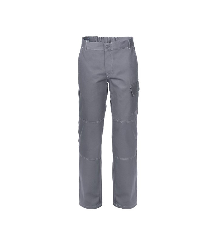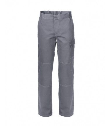 Chiusura alla patta con cerniera e bottone scoperto, 2 tasche anteriori interne, 1 tasca posteriore applicata a destra chiusa con bottone, 1 porta metro, 1 portapenne e 1 tascone laterale applicati a sinistra chiuso con aletta e velcro, elastico in vita posteriore, cuciture di colore a contrasto. drill 3/1, 100% cotone irrestringibile, peso 280 g/m2