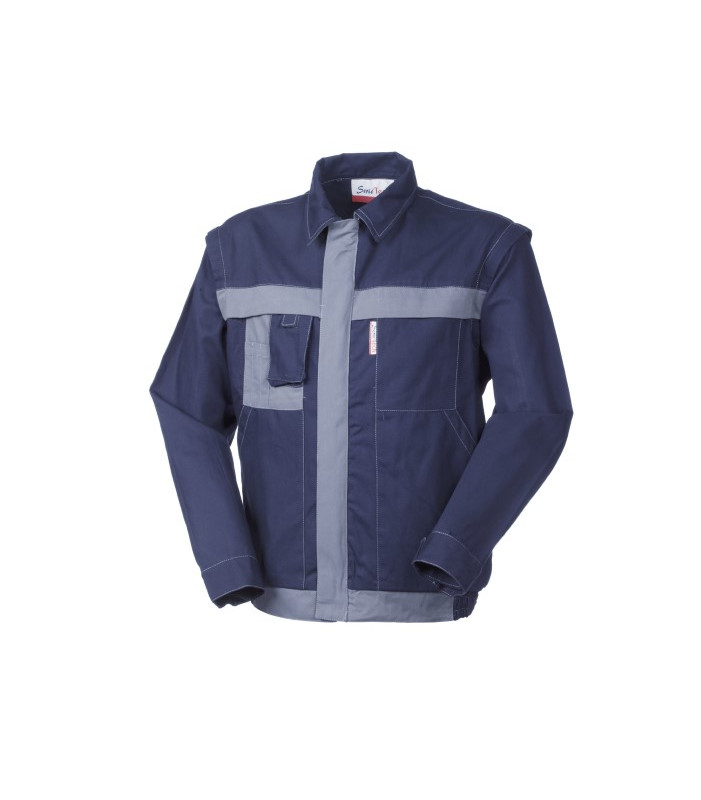Chiusura con cerniera centrale coperta, maniche staccabili con cerniera, polsino al fondo manica chiuso con velcro regolabile, cintura al giro vita con elastico ai fianchi, 2 tasconi applicati con apertura obliqua, 2 tasche applicate al petto di cui la destra con portapenne e porta telefono a soffietto, asola per il passaggio dell'auricolare per il telefono, strisce orizzontali anteriori e posteriori, patella copri cerniera, sotto collo e parte della cintura posteriore e anteriore in tessuto di colore a contrasto, cuciture con filo di colore in contrasto canvas, 100% cotone irrestringibile, peso 270 g/m2 con varianti in tessuto 65% poliestere e 35% cotone