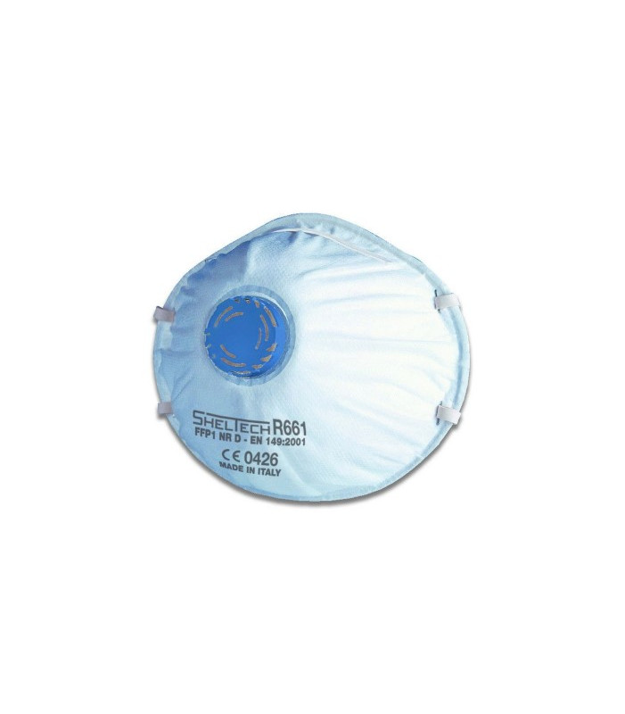 Facciale filtrante a forma di conchiglia in tessuto non tessuto pp, elastici in gomma di sintesi, stringinaso in plastica rinforzata con morbida guarnizione di tenuta in schiuma di gomma, valvola di esalazione per garantire maggior comfort in ambienti di lavoro caldi e umidi e/o dove il lavoro si presenti particolarmente gravoso, protegge da polveri, fumi e nebbie di tipo solido e aerosol con livello massimo di utilizzo fino a quattro volte il valore del tlv