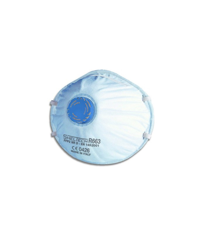 Facciale filtrante a forma di conchiglia in tessuto non tessuto pp, elastici in gomma di sintesi, stringinaso in plastica rinforzata con morbida guarnizione di tenuta in schiuma di gomma, valvola di esalazione per garantire maggior comfort in ambienti di lavoro caldi e umidi e/o dove il lavoro si presenti particolarmente gravoso, protegge da polveri, fumi e nebbie di tipo solido e aerosol con livello massimo di utilizzo fino a dieci volte il valore del tlv