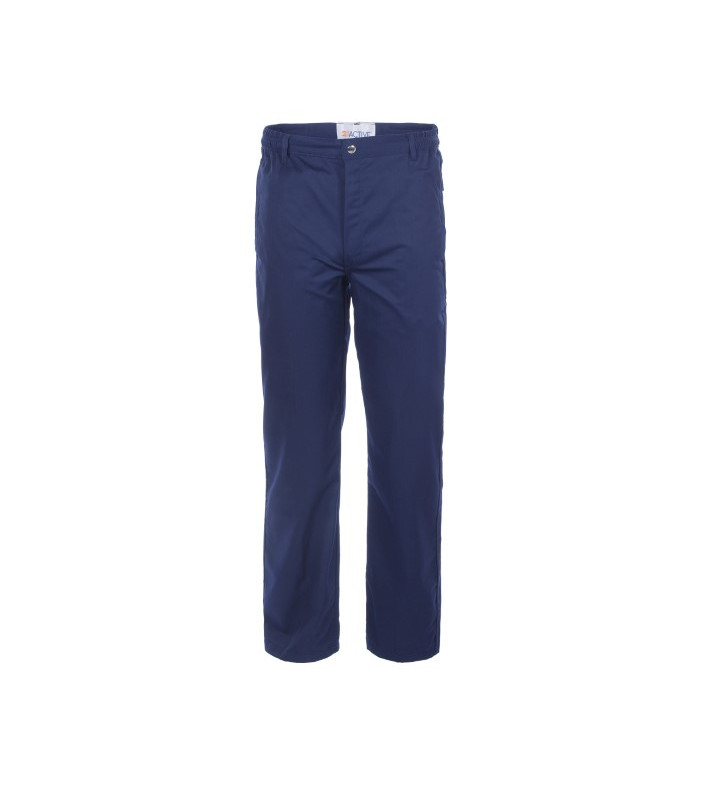 Chiusura della patta con cerniera e bottone automatico, elastico ai fianchi, 2 tasche anteriori chiuse con punto di velcro, 2 tasche posteriori applicate chiuse con aletta e velcro negastat hydrofoil antiacido e antistatico irrestringibile 65% poliestere 35% cotone peso 245 g/m2