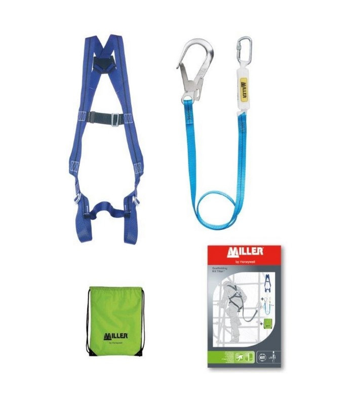 Kit compreso di imbracatura in poliestere a 1 punto di ancoraggio dorsale, 1 cordino a nastro con assorbitore di energia titan lungo 2 m, 1 moschettone cs20 in acciaio zincato apertura 18 mm, 1 gancio per ponteggio in lega alluminio apertura 63 mm, 1 sacca per il trasporto