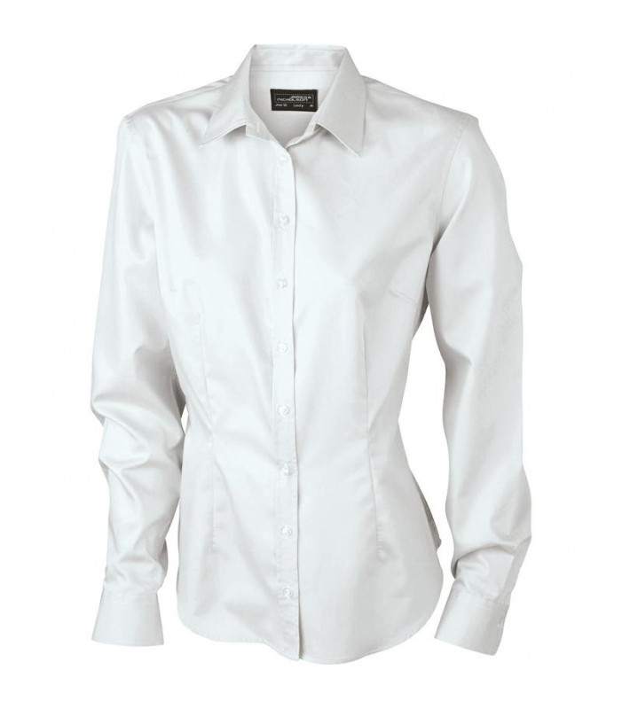 -sulle spalle, classica forma femminile grazie alle cuciture a freccetta sul seno e sulla schiena. orlo stondato, bottoni ricoperti, 1 bottone al polsino. 100% cotone, donna, manica lunga, pence sulla schiena, taglio sciancrato
