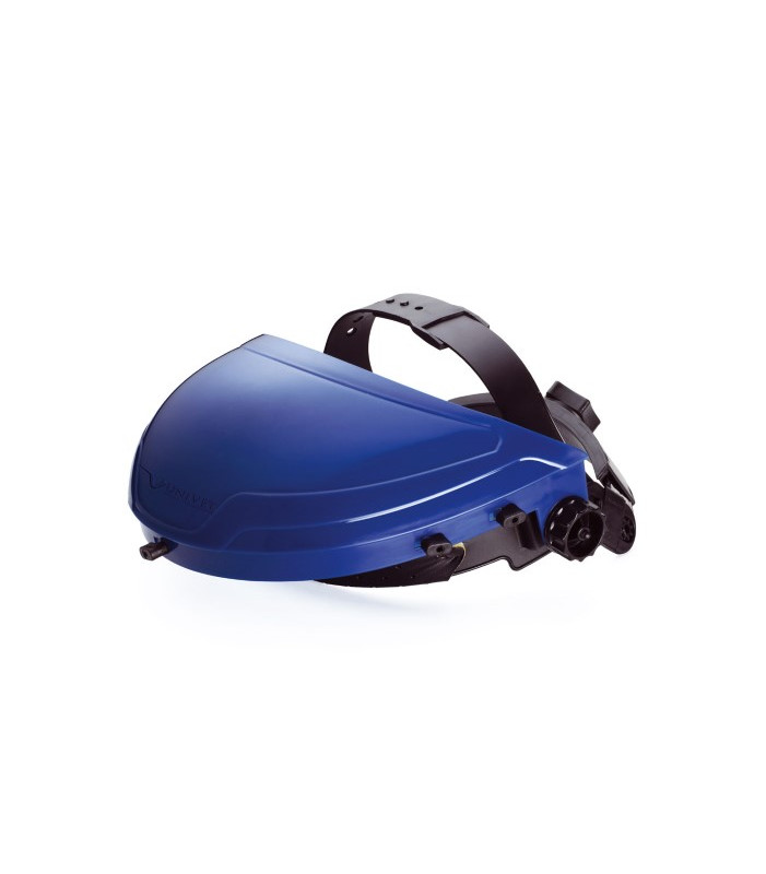 Semicalotta ergonomica in materiale anallergico, fascia frontale antisudore in spugna intercambiabile, banda superiore per la regolazione dell’altezza della calotta, regolazione circonferenza cranica tramite cremagliera (da 53 a 61 cm), ribaltabile di 90° tramite frizioni, 5 punti di aggancio per lo schermo, certificata con i simboli per il campo di utilizzo 3, 8 e 9 della en166 per protezione da schizzi liquidi, arco elettrico e proiezioni di metallo fuso, resistente ad impatti e a temperature estreme. priva di parti metalliche esposte per la protezione da arco elettrico.