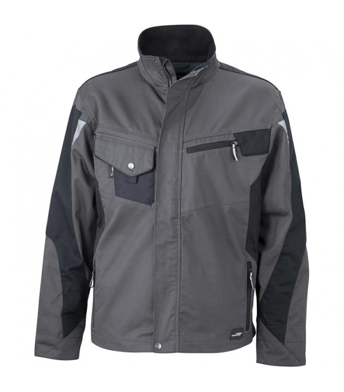 65% poliestere, 35% cotone. giacca da lavoro, colletto rigido, interno in pile, nastro di rinforzo alle spalle in cordura, zip frontale con protezione per il mento, apertura sul retro per la ventilazione, tasche multifunzionali, dettagli catarifrangenti davanti e sul retro.