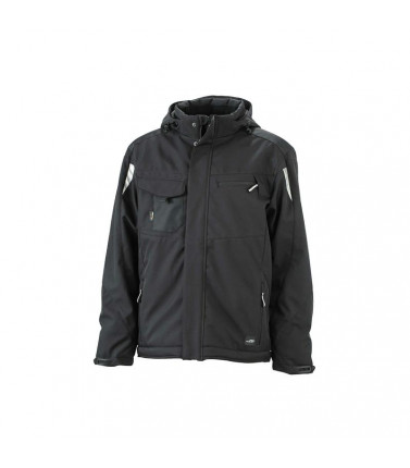 100% poliestere. giacca in softshell professionale con caldo rivestimento interno, tessuto robusto, antivento, traspirante e impermeabile. colletto rigido, interno in pile, cappuccio regolabile e rimovibile, rinforzo alle spalle con cordura, tasche multi-funzionali, dettagli catarifrangenti sulle maniche e sul retro.