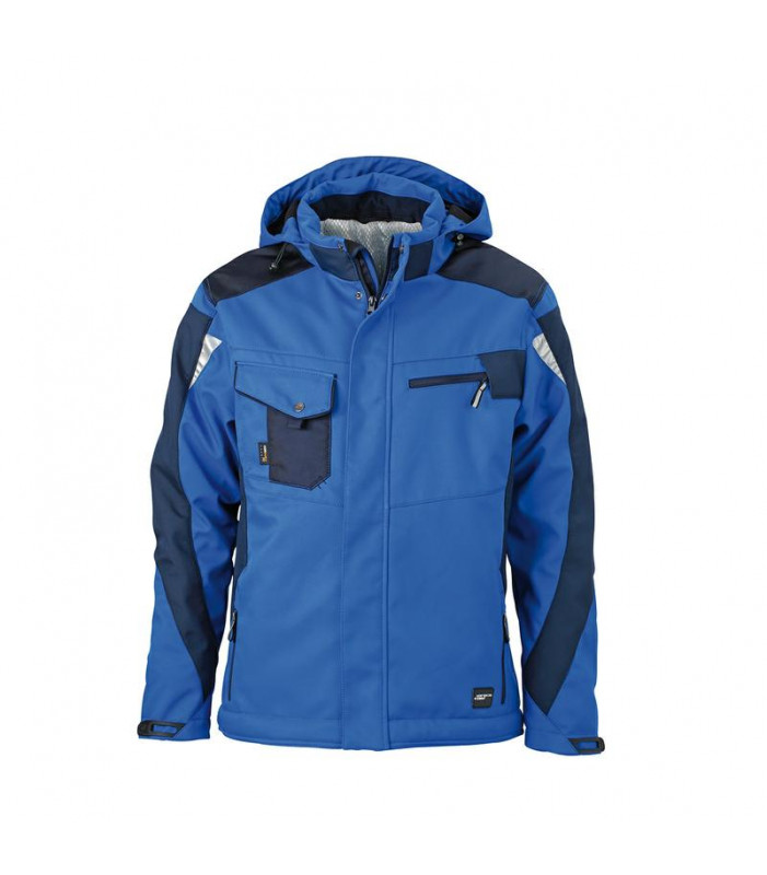 100% poliestere. giacca in softshell professionale con caldo rivestimento interno, tessuto robusto, antivento, traspirante e impermeabile. colletto rigido, interno in pile, cappuccio regolabile e rimovibile, rinforzo alle spalle con cordura, tasche multi-funzionali, dettagli catarifrangenti sulle maniche e sul retro.
