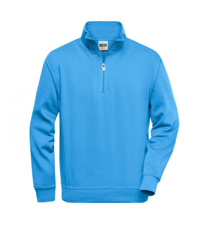70% cotone pettinato, 30% poliestere, felpa con collo alto e zip, tessuto resistente, elastico a coste lavorato a maglia sui polsini e girovita. lavabile a 60°. gr 290