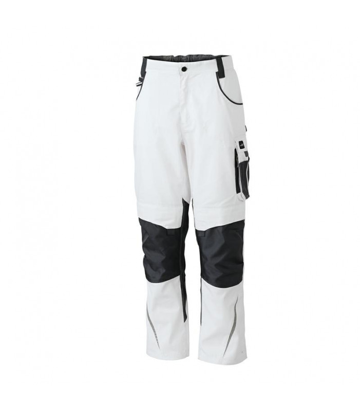 65% poliestere, 35% cotone, pantaloni da lavoro in tessuto misto e robusto, tasche per ginocchiera rinforzate con cordura, tasche multi-funzionali per oggetti da lavoro, dettagli catarifrangenti davanti e sul retro. gr 260