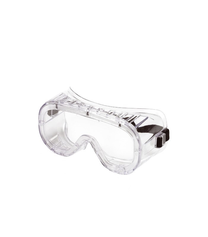 Montatura in pvc trasparente, fascia elastica regolabile in tessuto, lente incolore in policarbonato antiappannante, sistema di ventilazione indiretta, sovrapponibile agli occhiali correttivi, peso 73 grammi, classe ottica 1, impatto b